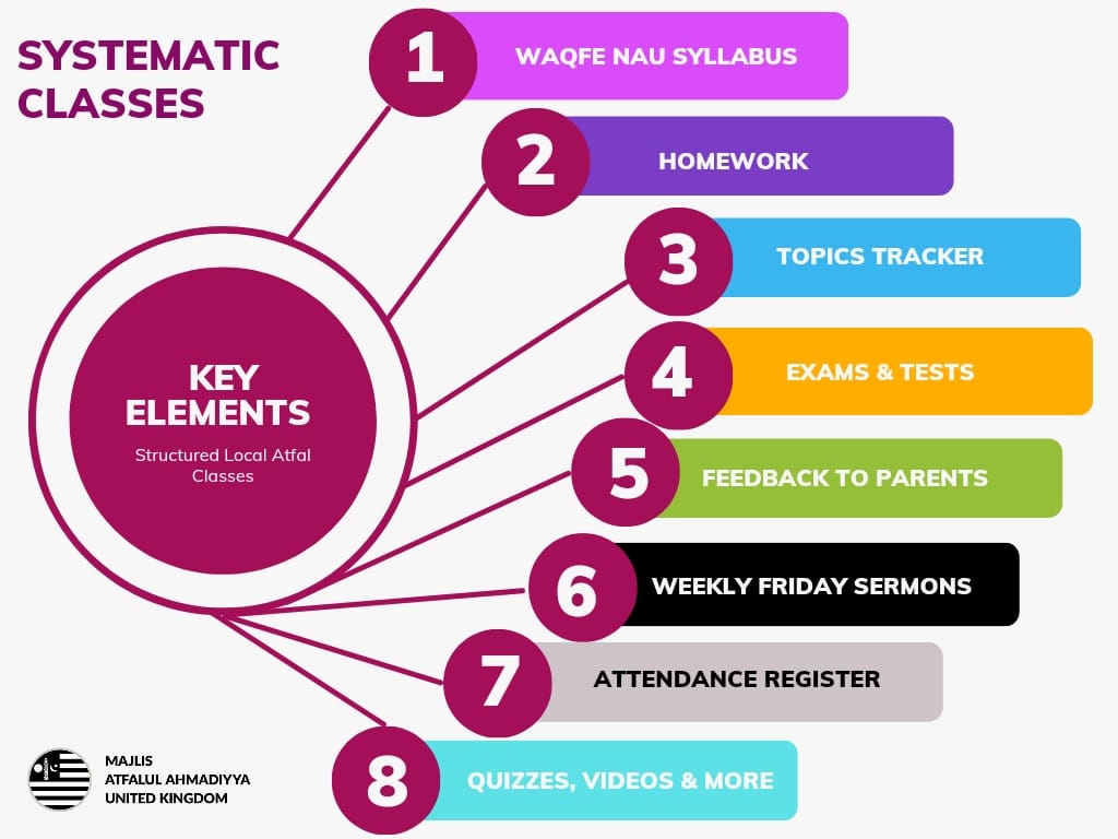 Local Atfal classes are the most important and key part of the local basic structure of Atfalul Ahmadiyya. (To learn more about the basic local structure, visit www.atfal.org.uk/basic-local-structure). Therefore, all local Atfal classes must be quality classes and run in a well-organized and structured manner offering the maximum benefit to the Atfal.